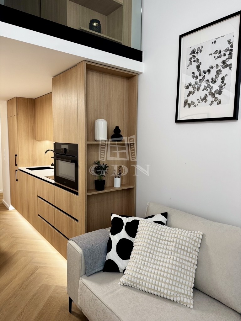 A lakás magas belmagassága lehetővé tette egy 11,68 m²-es állógaléria kialakítását, amely hálószobaként és extra tárolóként is funkcionál, így a tér jóval tágasabb és kényelmesebb a megszokottnál.