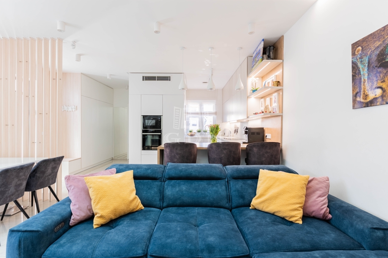 A lakás különlegessége a belső kétszintes kialakítás, amely tágas, jól elkülönülő élettereket biztosít.