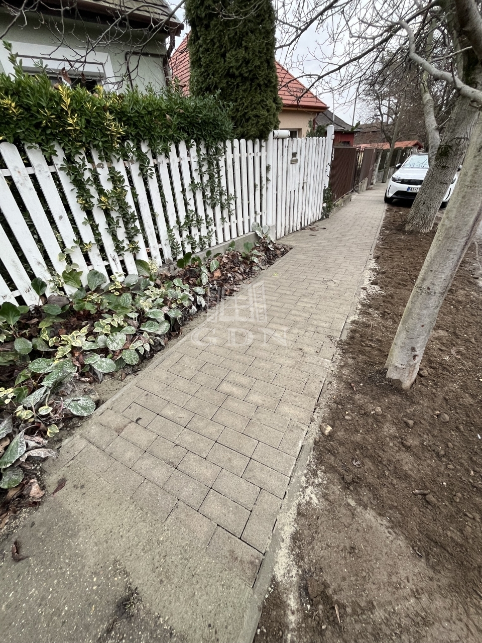 Az épület előtt, az utcán a járda térkövezése új, az idén készült el.