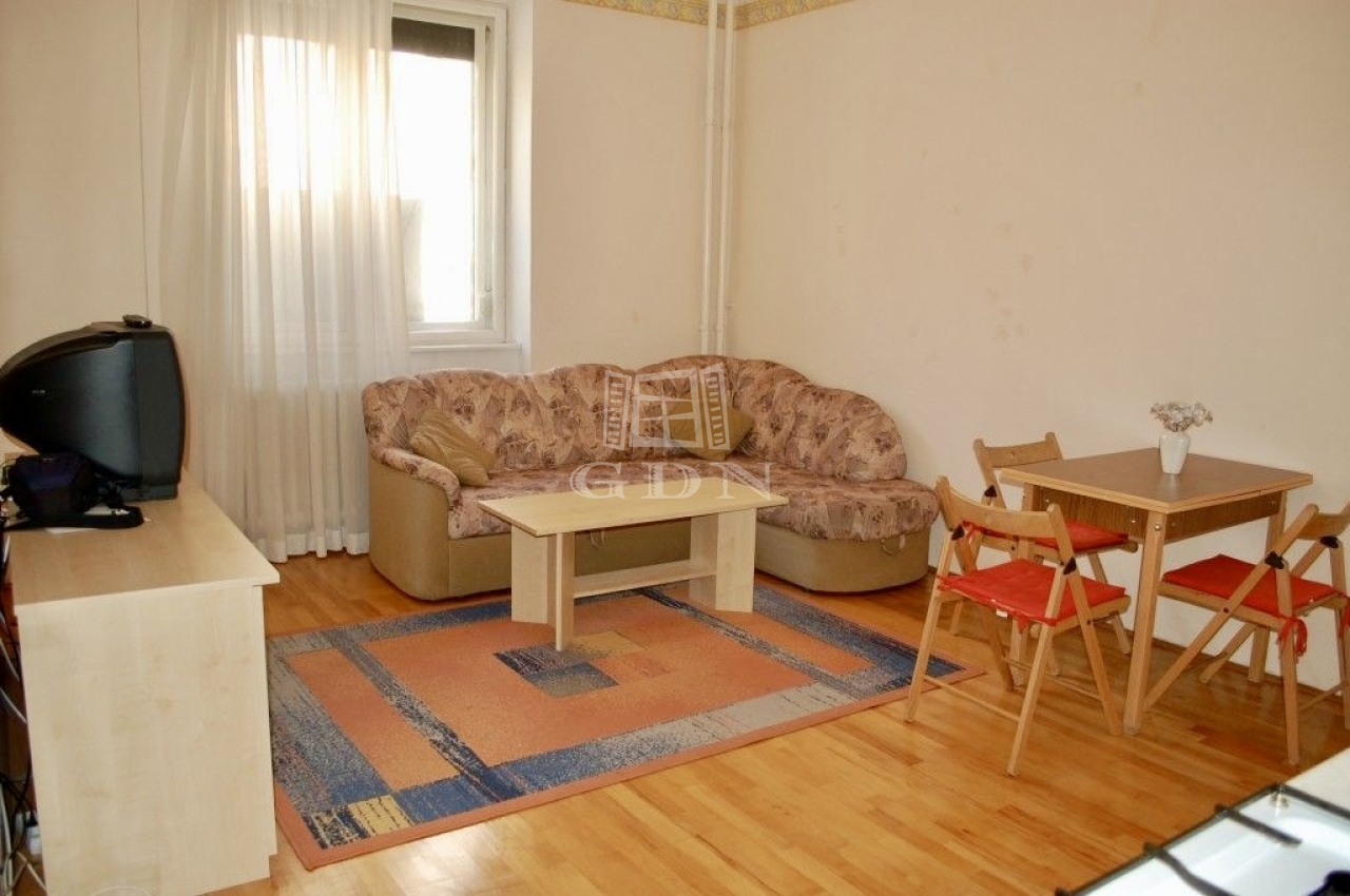 A lakás elrendezése: az előszobából nyílik külön egy amerikai konyhás nappali + hálófülke egy kis gardróbbal és egy fürdőszoba toalettel.