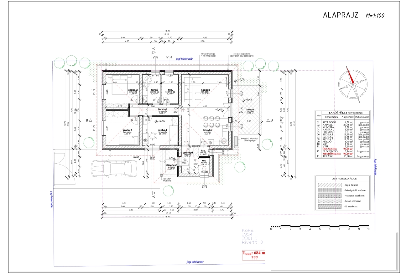 A tartószerkezeti falak Porotherm P30N+F téglából, betonkoszorúval, fa födémes tetőszerkezettel készülnek. A lábazat 10 cm polisztirol lépésálló, a homlokzatok 15cm-es EPS, a vízszintes födém 30 cm ásványgyapot szigeteléssel lesz ellátva.
