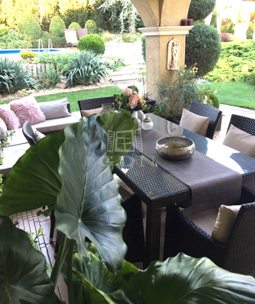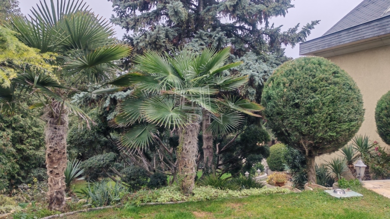 A kert parkosított, automata öntözőrendszerrel ellátott, medencével kiegészített. Az évek során kialakított, gondosan válogatott növényállomány értéke szinte felbecsülhetetlen, igazi, intim kertvárosi hangulatot biztosít.