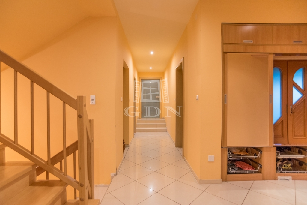 az emeleten négy világos hálószoba kapott helyet, valamint egy zuhanyzós fürdőszoba és egy különálló vizes helyiség is szolgálja a kényelmet. Ugyanitt található a garázs felett kialakított, 60 m²-es beépítésre előkészített tetőtér, amely akár egy külön bejáratú lakássá is átalakítható – ideális többgenerációs együttéléshez vagy irodai funkcióra.