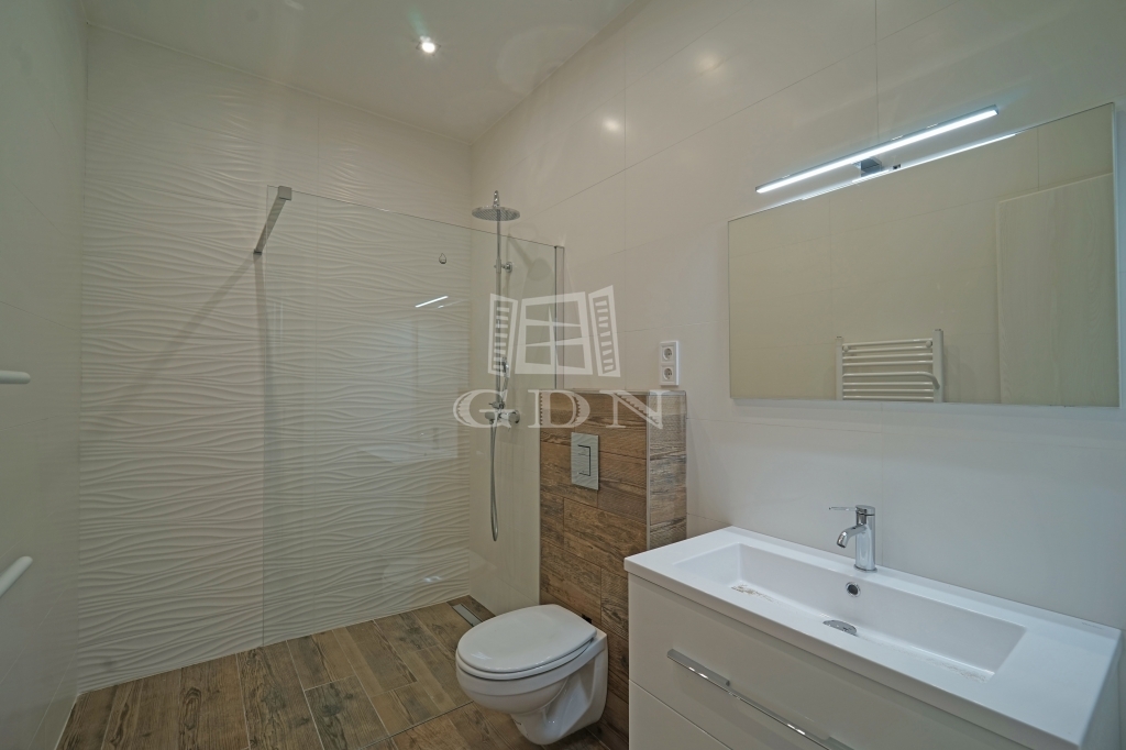 A minőség fontos szempont volt a kilakításnál, a földszinten a padlót 60x120-as márvány lapokkal burkolták, a lépcsőház korlátai rozsdamentes acél és üveg kombóval készültek, a három fürdőszoba szaniterei, bútorai és csaptelepei az Arezzo Design termékeiből lettek ízlésen kiválasztva.