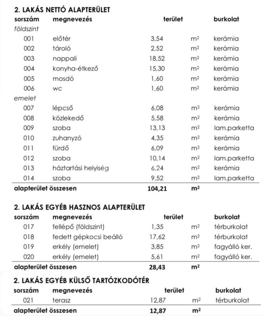 A 2. számú lakás nettó 104 m² alapterületű, jól átgondolt, kétszintes elrendezéssel.