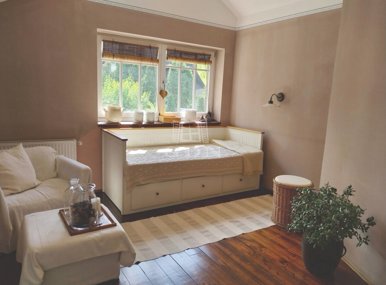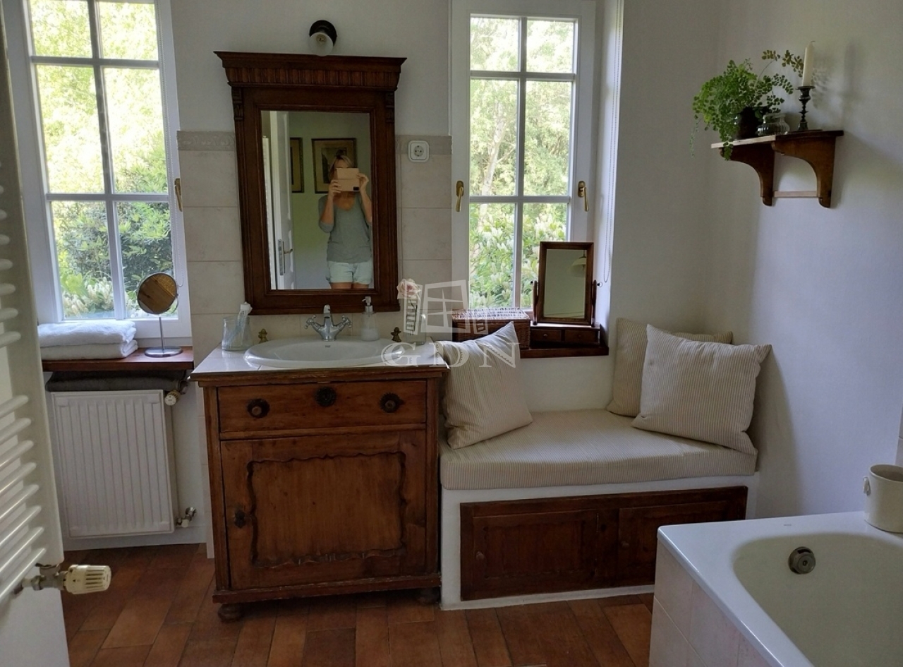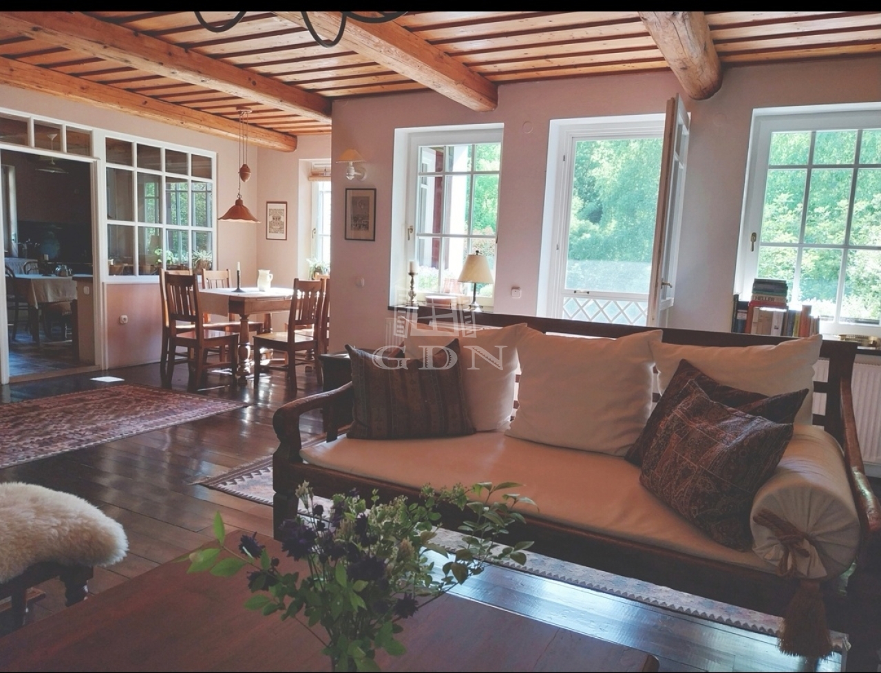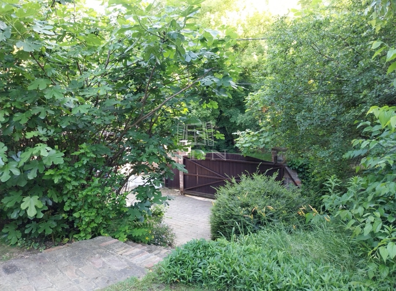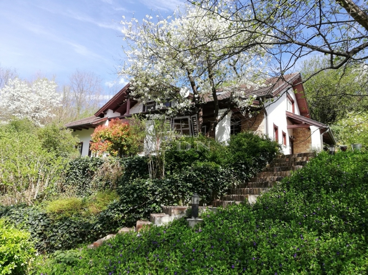 Budaörs Kamaraerdőn eladó egy kivételes hangulatú és adottságú, egyedi stílusú családi ház. A teleknek két utcáról van bejárata, elhelyezkedése olyan, mintha egy parkerdő közepén lenne, a házat minden oldalról romantikus kert öleli körül, ide néz és nyílik minden nyílászáró. Csak egy szomszédja van, a szemben lévő oldalon mogyorós, ős fák és kis tó található.