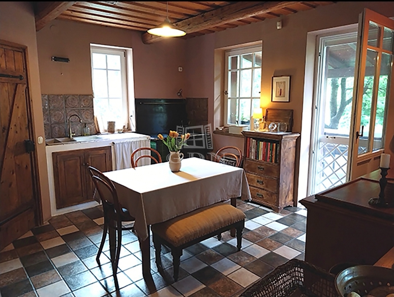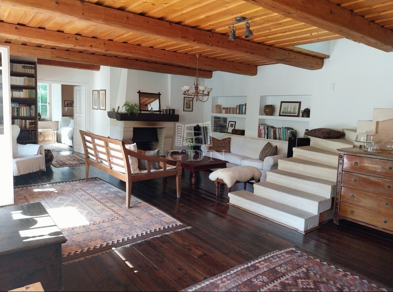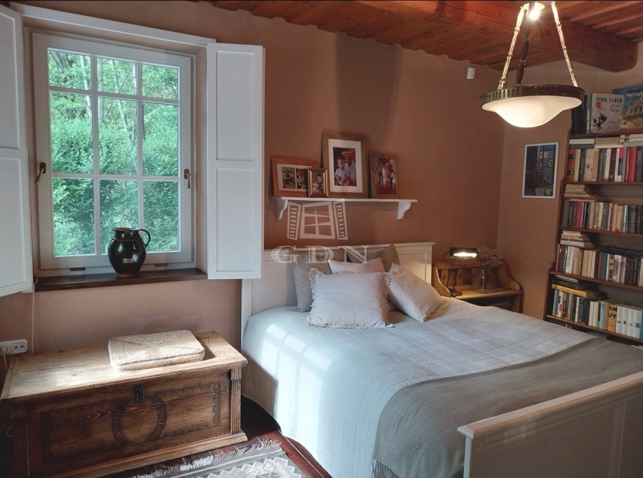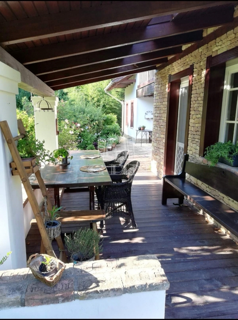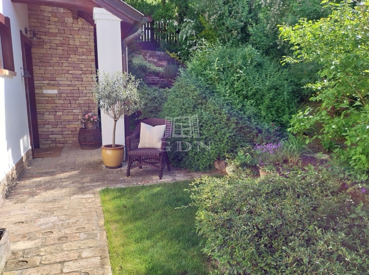 A kert teraszos elrendezésű, automata öntözőrendszerrel és kúttal ellátott. A kialakítása óta eltelt több mint 20 évben a fák, cserjék, talajtakarók, virágos növények nagyszámú együttese és mérete kivételesen szép, barátságos, madárcsicsergős és intim környezetet biztosít. A házban a nappali jellegzetes hangulatát hatalmas, nyitott tűzterű kőkandalló, egyedi kialakítású kőlépcső és több mint százéves gerendákból álló fa álmennyezet adja meg, ami a konyhában és a hálószobában is megjelenik. A nappali és a konyha is közvetlen kertkapcsolatos a fedett és nyitott teraszokkal. Az emeleti hálószobákból a kert és a tágabb természeti környezet felé néző fedett erkélyre lehet kijutni.