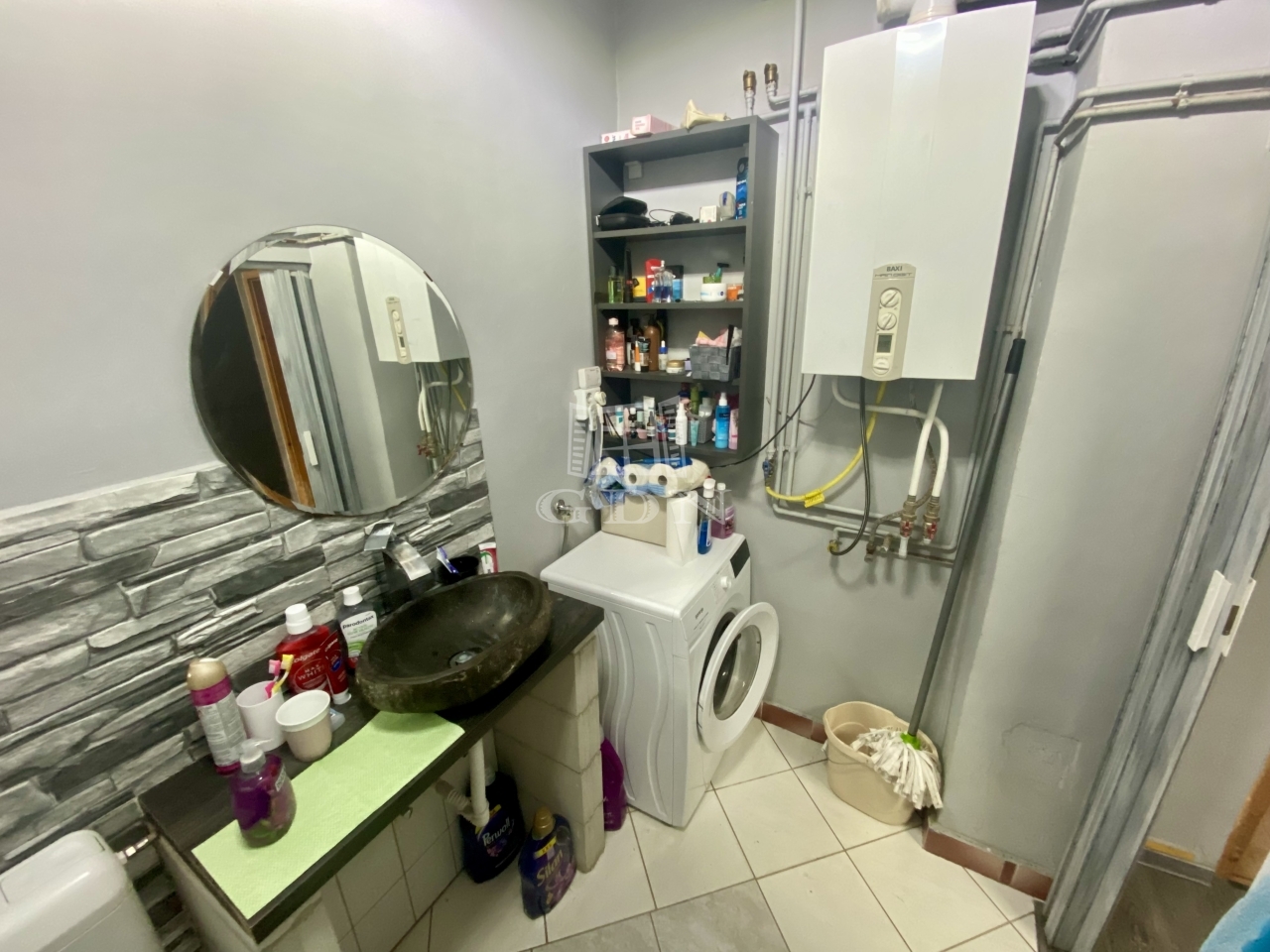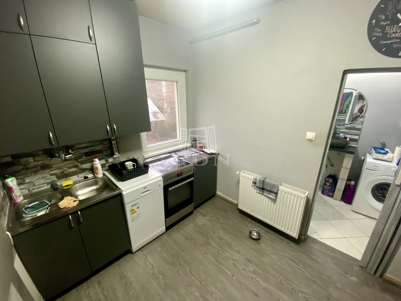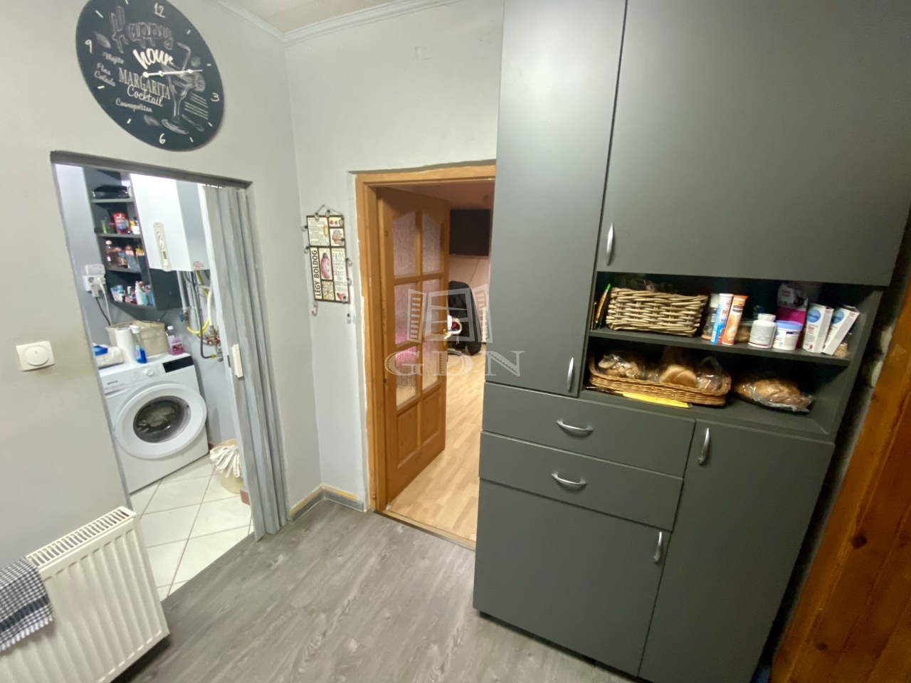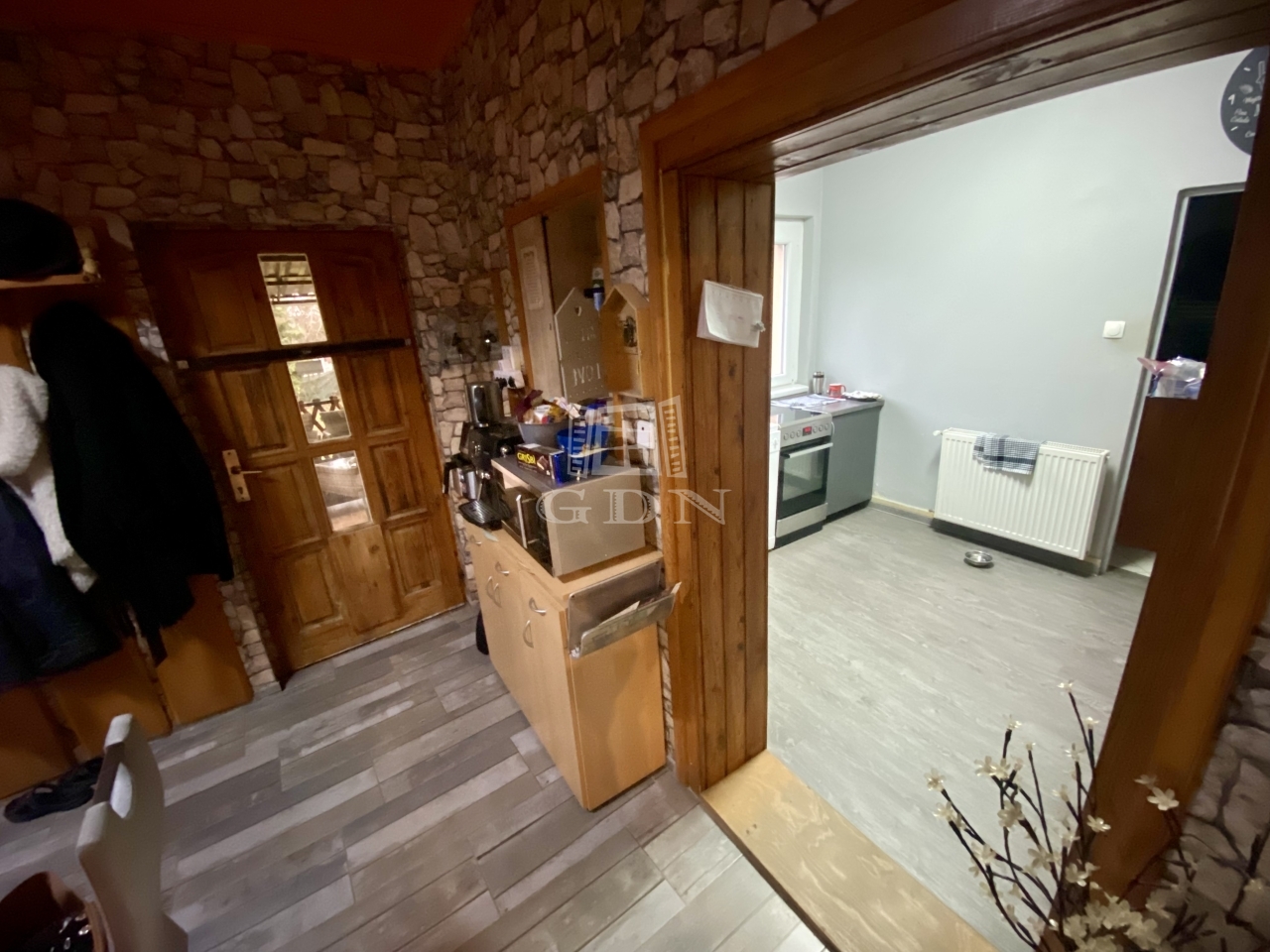 A teraszról az előszobába lépve került kialakításra az étkező, ahonnan nyílik egy szoba, illetve a konyha, melyben iparossal, egyedileg méretre készített konyhabútor található. A konyhából nyílik a fürdőszoba illetve még egy szoba. A fűtést gáz cirkó rendszer biztosítja.