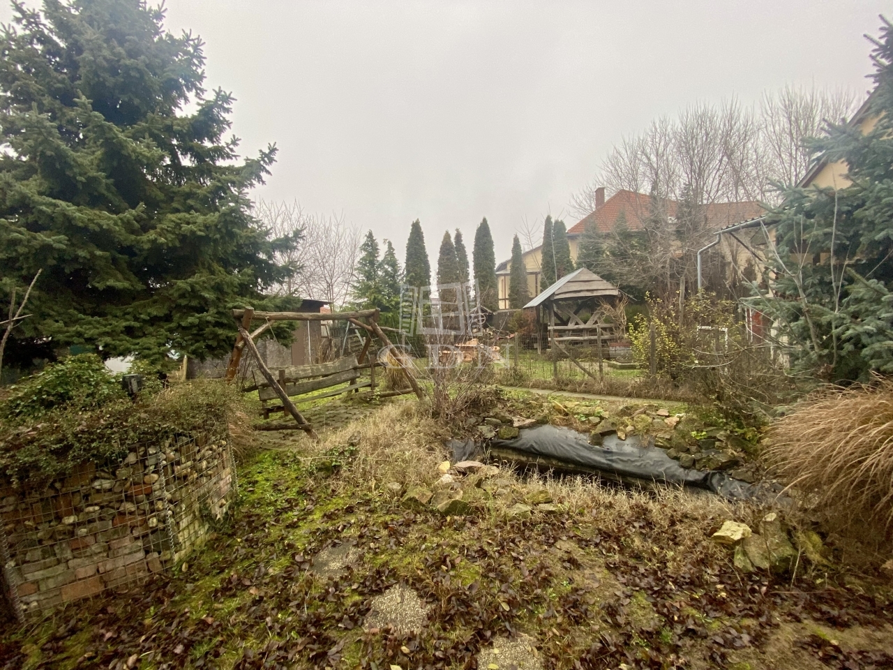 A kert igazi különlegesség: több, pihenésre alkalmas rész került kialakításra, keményfából épített fedett kiülővel, dupla gépkocsi-beállóval, kerti tóval, valamint gabion kerítéssel és kövekkel díszített magas ágyásokkal, örökzöld növényekkel. A kellemes hangulatról 2 db hintaágy is gondoskodik. A magas növényzettel körbevett telek teljes intimitást biztosít, elzárva a külvilágtól.